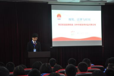 聘任仪式结束后吕瑶检察长为该校初三年级全体学生上了一堂以“规则 法律与时间”为主题的法治教育课。