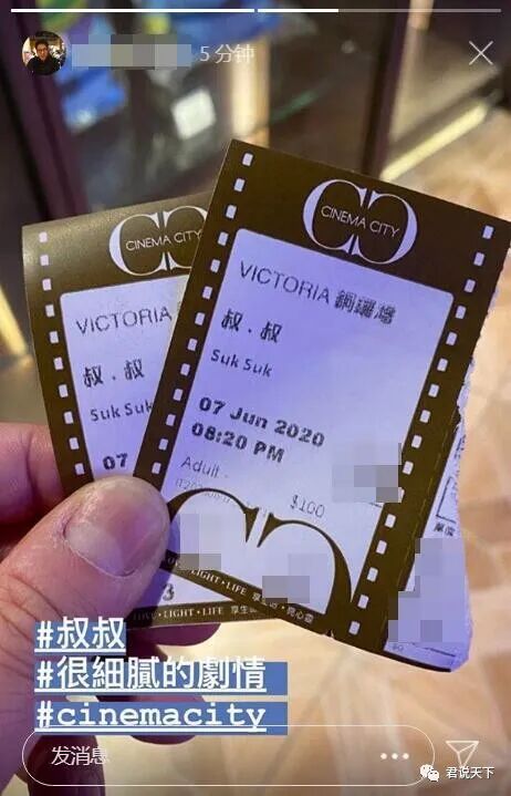 值得注意的是,他们看的是8时20分的场,结束时间大概是晚上十点,刚好可以赶回家陪子女睡觉,而霍启刚大概在11点晒电影票,估计就是哄完小孩子入睡之后。