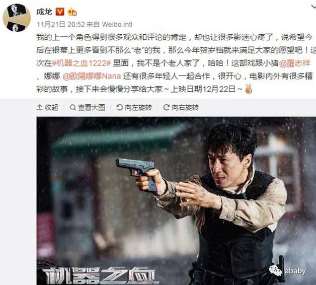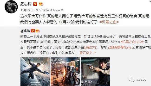 就在11月21日成龙大哥发微博说,既然大家不想看我那么老那就满足大家的愿望哦。在12月22日成龙的新电影《机器之血》要上映了,成龙大哥表示跟年轻人一起合作,非常开心。