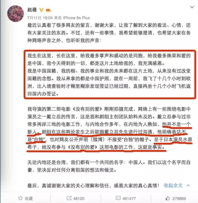 然后好死不死,赵薇竟然在7月11日发了长微博,澄清自己是中国人。