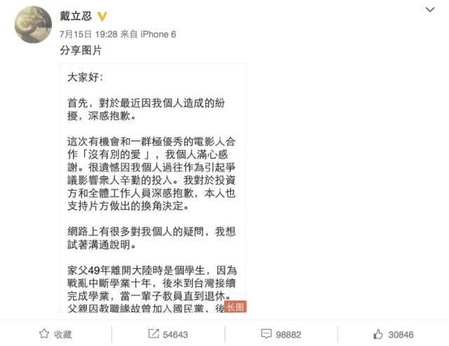 7月15日,@没有别的爱movie 发声明表示将换掉演员戴立忍,赵薇转发向网民致歉;