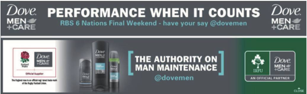除了在关键时刻触发广告,技术还可以实现不同情境下创意的实时变化。2014年,联合利华多芬男士从天空体育获取苏格兰皇家银行六国橄榄球赛的新闻和最新比分信息,并利用SIZMEK的动态创意平台为其HTML5广告生成实时的广告内容。该广告的点击率高达0.84%,转化率是行业平均水平的两倍。