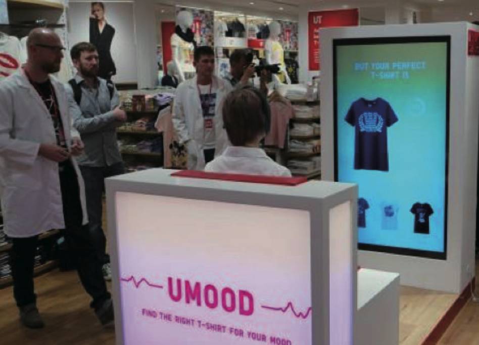 2015年10月,电通Isobar和Dentsu ScienceJam与生物传感技术公司NeuroSky合作,为优衣库在澳大利亚推出了一套Umood智能选衣系统,消费者只需带上头戴式神经传感器,并观看几段测试视频,传感器便能够判断消费者的情绪,与店里的衣服进行匹配,从而为消费者推荐服装和款式。