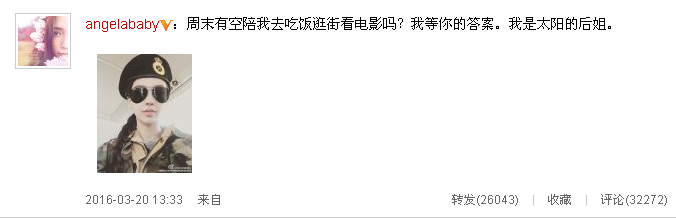Angelababy在20日于微博贴出一张自拍照,只见她穿着迷彩军装和黑色军帽,将一头亮丽的秀发绑成俐落的辫子头,再戴上酷劲十足的黑色飞行墨镜,帅气的模样马上就让人联想到最近的大热剧《太阳的后裔》中的宋仲基,而她更模仿男方在剧中的口气说话,立刻让粉丝笑成一片。