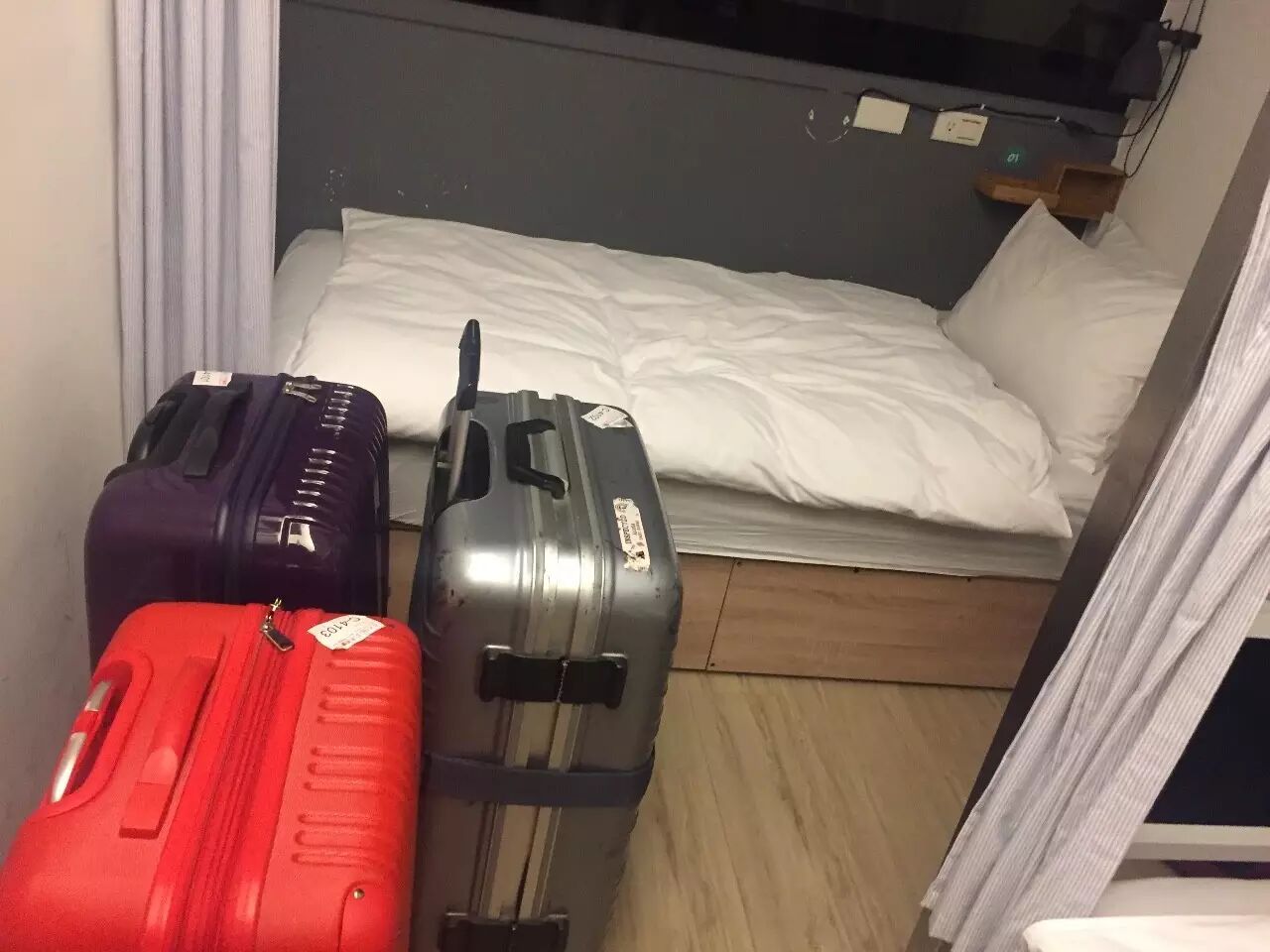 回到青旅,客厅里的韩国人很严肃地围坐一桌集体沉默,可能在玩狼人杀吧。进入房间,空间很小却又很cozy,只能轮流打开箱。(我还是背靠门照的,从这个拍照角度你应该知道房间到底有多小了)