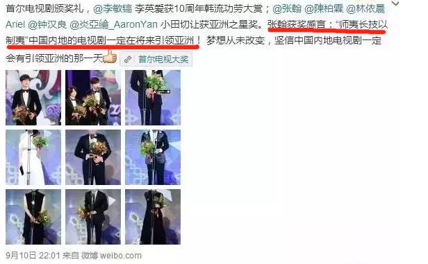 得奖本来是一件好事,可万万没想到的是领奖的时候,张翰竟然说道:“师夷长技以制夷,希望中国内地的电视文化会接下来引领整个亚洲。”