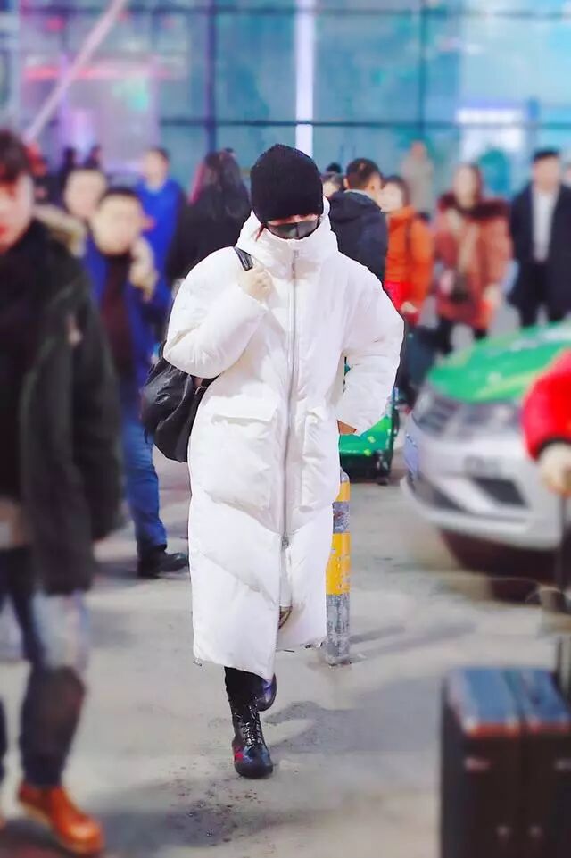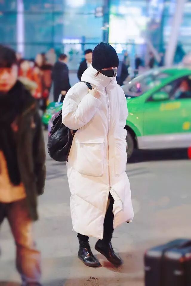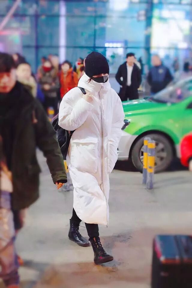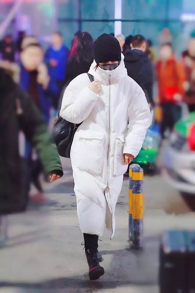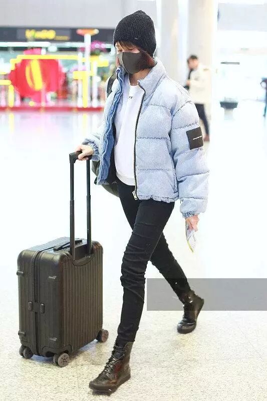 白色长款羽绒服,搭配一双高腰马丁靴,整体包裹的非常严实了。尤其是高领款式结结实实的把脸包裹起来了,再戴个针织帽,就露出来两个眼睛,不得不说保暖是真保暖,但是冬天会这样穿的女明星估计不多。一身经典黑白配,简简单单走机场,真是全靠气质撑起来自己的风格。
