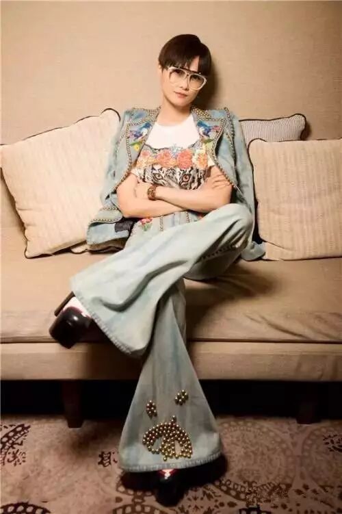 春春身穿GUCCI 2017春夏系列刺绣铆钉牛仔夹克及长裤,内搭老虎印花T恤。