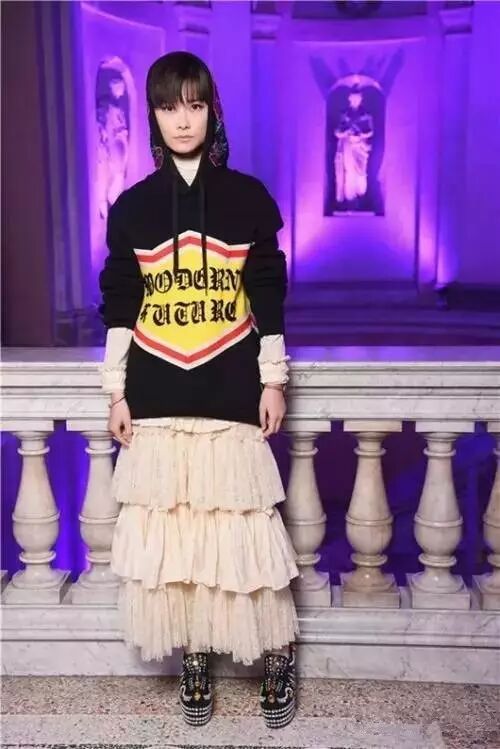 大秀过后,春春换上了一身GUCCI 2017春夏黑色帽衫搭配百褶蛋糕裙,与之相搭配的是G-Frame系列腕表以及Gucci Le Marché des Merveilles系列手镯及双虎头戒指,时尚又前卫。