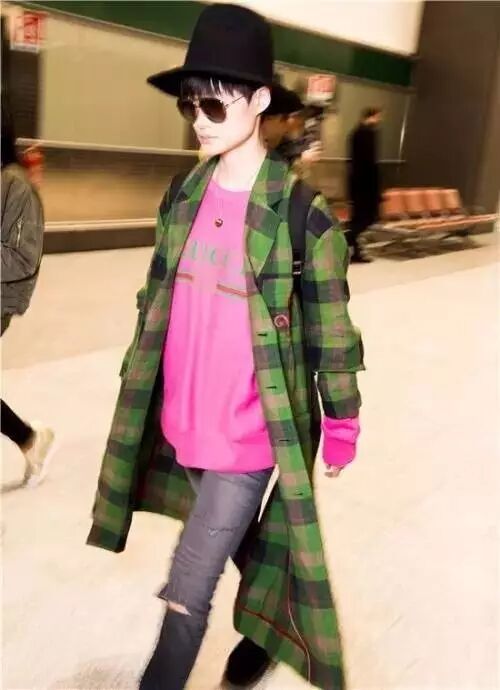现身机场的春春身着GUCCI 2017春夏系列绿色格纹刺绣外套,内搭粉色印花卫衣,身背Web Animalier刺绣双肩包,头戴黑色宽边帽,酷感十足。