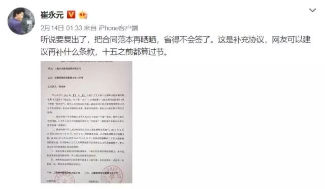 ▲崔永元则再次晒出范冰冰与剧组《大轰炸》的补充协议,提醒所有人:听说要复出了,把合同范本再晒晒,省得不会签了。