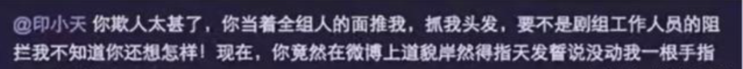 印小天对自己没做过的事,当然不会承认。他否认了女演员的说辞,还对天发誓,没有动对方一根手指头。