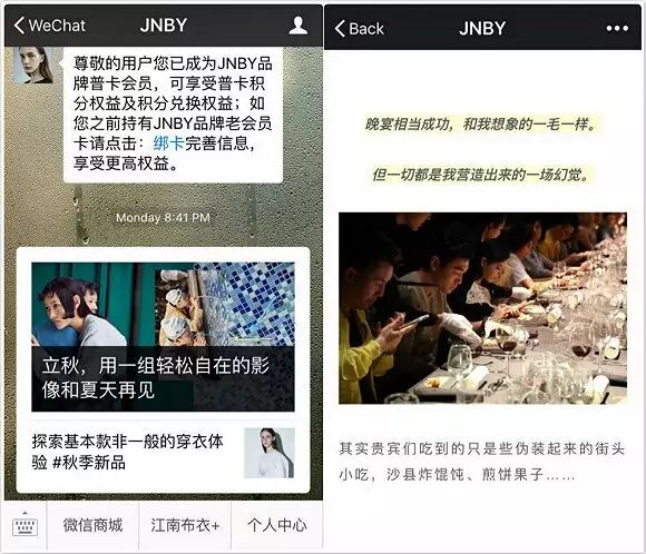 江南布衣的微信公众号从2015年开始经营,上面设有个人中心、微信商场和文章推送。从账号发布的内容来看,它并没有将自己限制在“卖衣服”的框框里,7月13日的一篇《我做的一场欺骗了100位高贵宾客的晚宴》,讲的是一个多动症患者在北京尤伦斯当代艺术中心请客吃饭的故事。