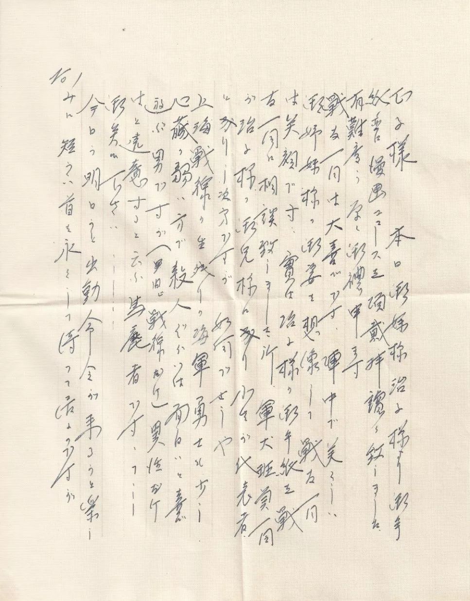 他们在入伍前,有人告别了父兄,有人初为人父,有人遭到强征,有人自愿入伍……在与家人的通信中,讲述的往往是日常训练和生活环境;在与友人的通信中,以分享作战情况和战略政策为主。侵华日军也思念自己的家乡,比如山本弘在写给自己父亲的信中提到:“战场是一个格外残酷之地。在这样的地方收到父亲寄来的包裹……这对于我已是最开心的事……我非常思念遥远的家乡,思念家乡的山,思念波涛汹涌的玄海滩。”