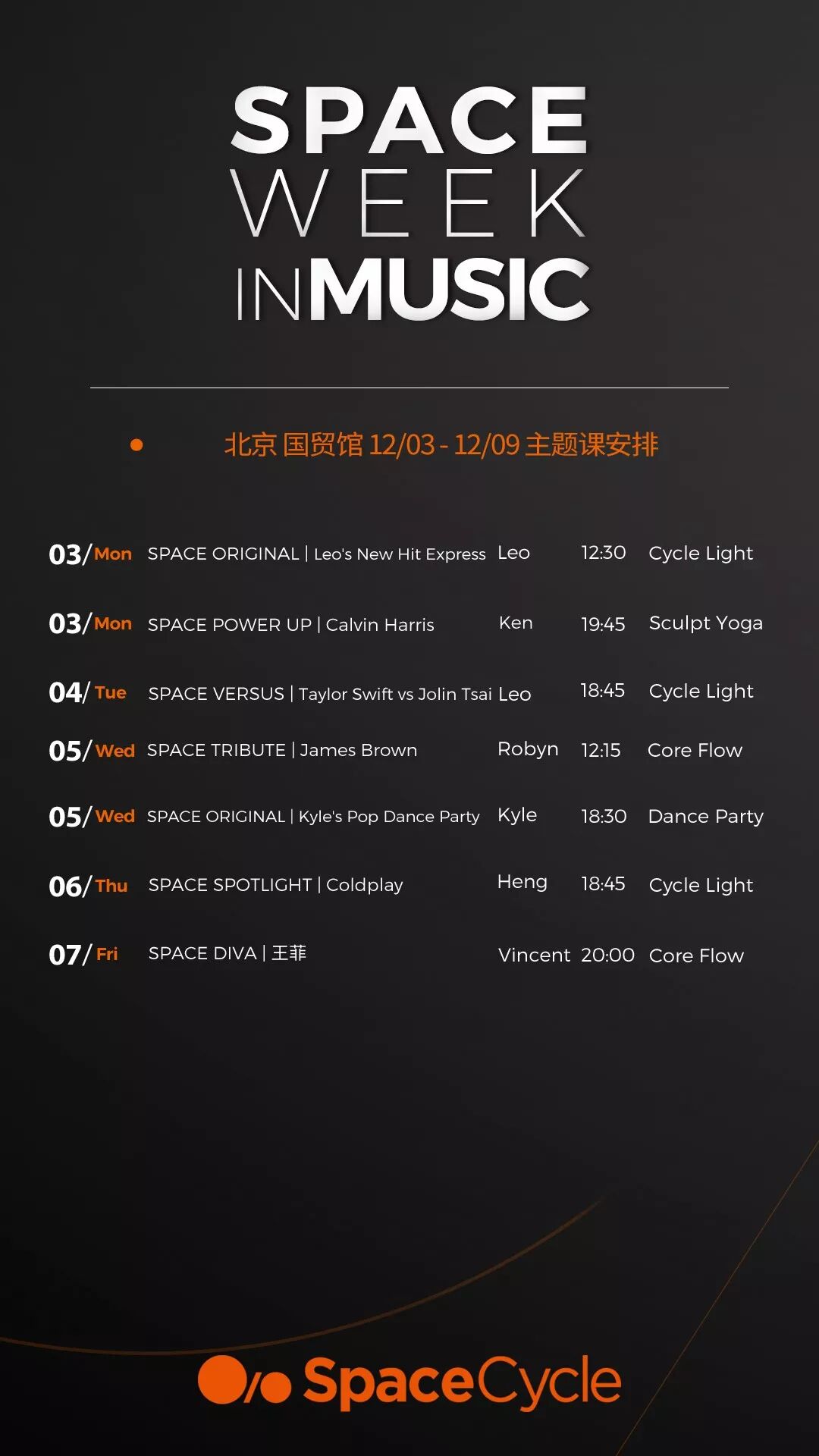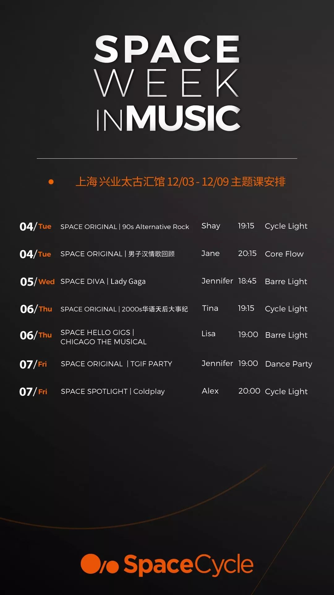 下周的主题课新歌单星光熠熠,其中有 DIVA 齐聚的派对, 包括华语女团代表 S.H.E;2000年华语天后大事记 ;王菲、Lady Gaga 和 Christina Aguilera ,充满了耀眼女性光彩;还有当代流行音乐代表 Calvin Harris 以及现代灵魂教父 James Brown...下周 SPACE 主题歌单名人堂,熟悉的旋律一响起,回忆的脚步就收不住,打开APP 报名,来SPACE 名人堂运动派对享受畅享运动和你的独家青春回忆!