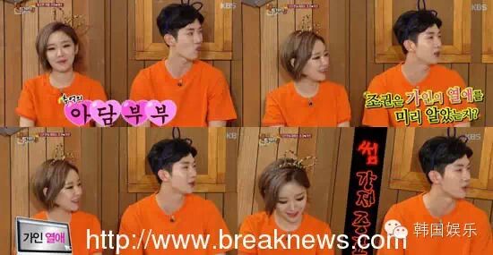 昨天(7日)播出的《Happytogether3》中佳仁,赵权出演了“危险的暧昧”特辑,对于佳仁的恋情赵权如实表示:我不知道,通过网上报道才知道,佳仁回答:我还问过“我可以恋爱吗?”而后赵权又说:本来还想以“亚当夫妇”受到更多关注,却被佳仁的恋情强制制止了。