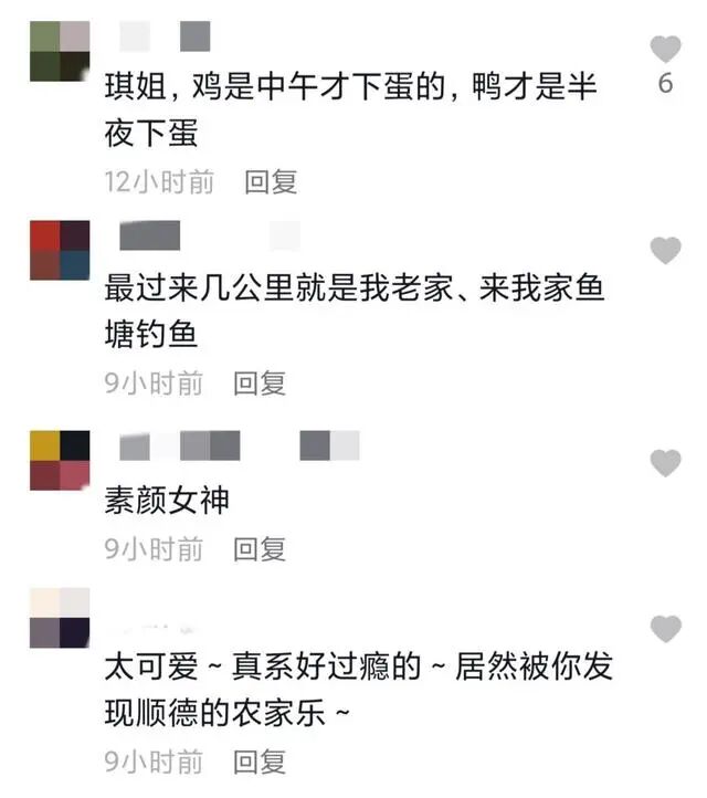 网友看了麦家琪晒出的视频,有人告诉她小鸡到了中午才会下蛋,还有的网友称赞她是素颜女神。也有网友表示自己老家离这个农家乐很近,欢迎她到自己家来钓鱼。