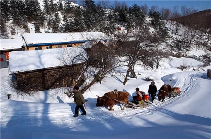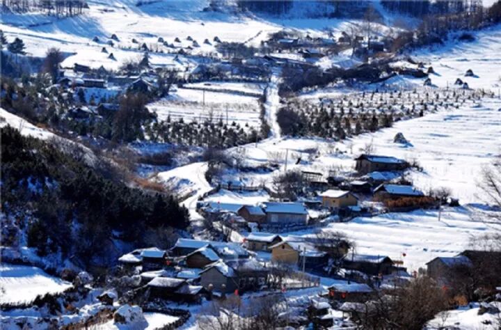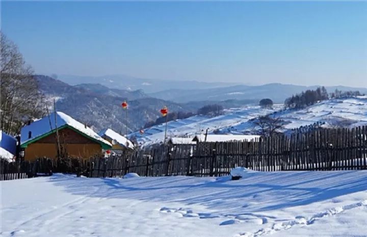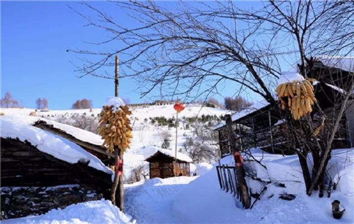 在皑皑白雪的映衬下,这里仿佛是一幅水墨丹青画。错落有致、顺山势而建的农家院,袅袅的炊烟,一道道的篱笆墙,弯曲的小路,挺拔的青松和那一簇簇的柴火垛……