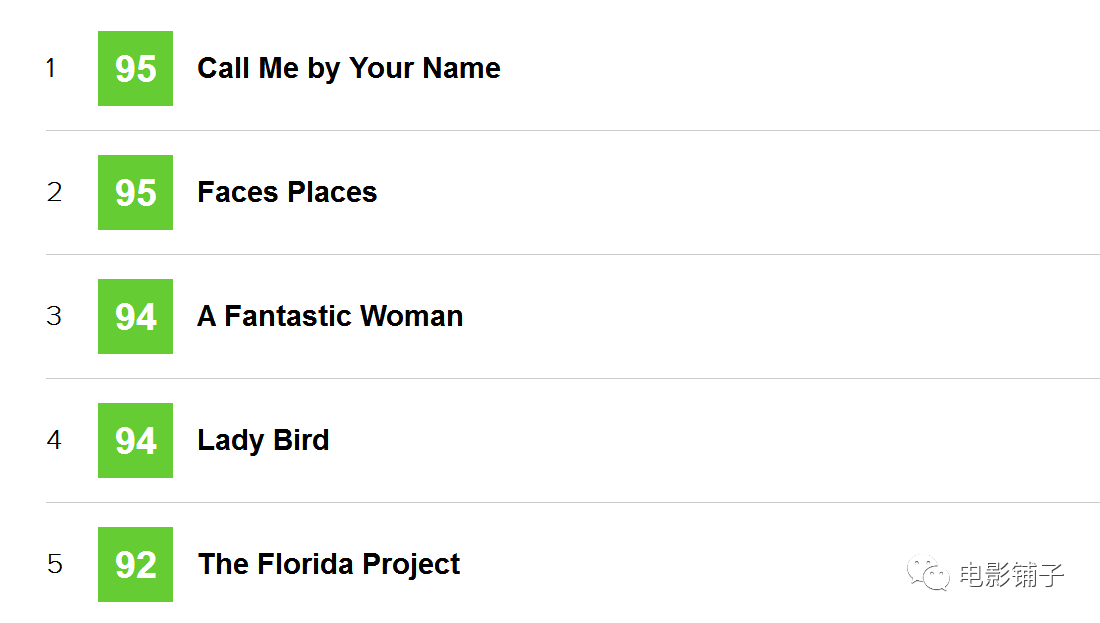 《逃出绝命镇》《敦刻尔克》《金刚狼3》《请以你的名字呼唤我》《极盗车神》《佛罗里达乐园》两个榜单都上了。