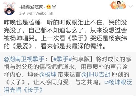 上一期,杨坤深情演唱了彝族民谣《长子》,不仅勇夺周冠军宝座,更是成为一颗重磅“催泪弹”,大批网友高呼“被杨坤唱哭”、“杨坤的歌我的泪”、“很久没有一首让我反复流泪的歌了,转粉坤哥”,各大平台的评论区都是泪水与掌声齐飞,网友纷纷留言称“本季最好听的一首歌。”