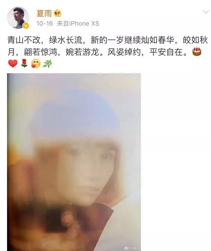 还记得之前夏雨为袁泉庆生,配文是"青山不改,绿水长流,新的一岁继续灿如春华,皎如秋月,翩若惊鸿,婉若游龙。风姿绰约,平安自在。"果真夏雨也是老婆的小迷弟,这段表述写的贴切极了。