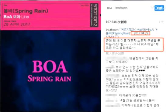 在今年4月28日宣布回归歌坛的BoA,在25日时,公司放出了新歌《春雨》的预告片。然而,在预告片推出之后,BoA立刻将该影片转发到自己的INS上,怒斥SM公司直言到:“为什么连我名字大、小写都分不清楚呢?我不是BoA吗?请确认好后再上传。”随后,SM娱乐也重新修改了影片中的字母问题之后,再重新上传了预告片。