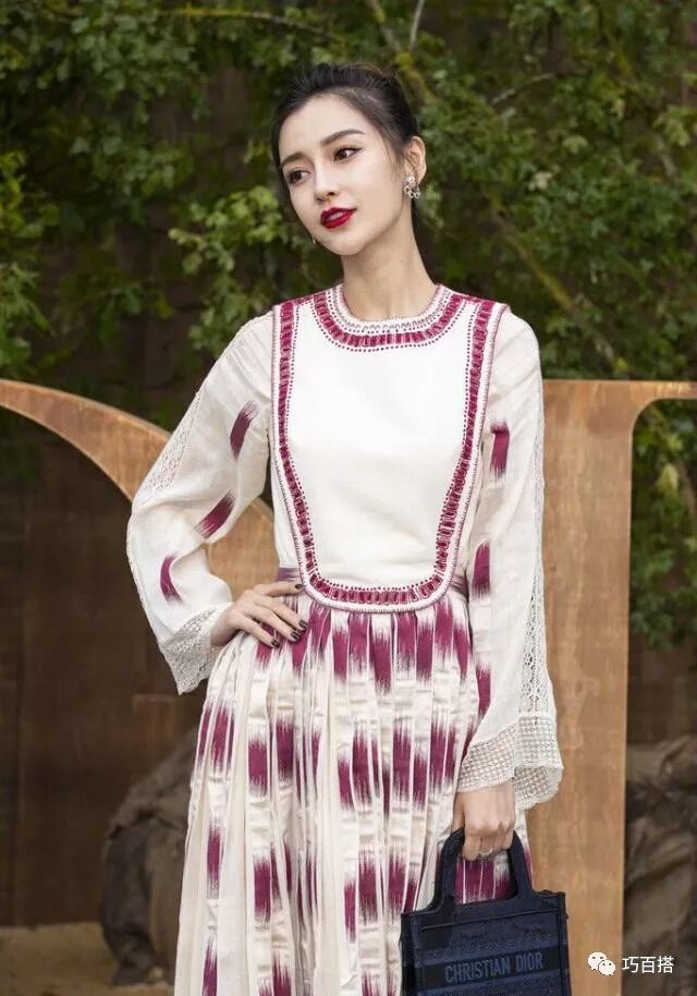 ▲搭配解析:近日的Angelababy尤其钟爱异国风情,多彩的配色,精致的花纹,是她的标配。