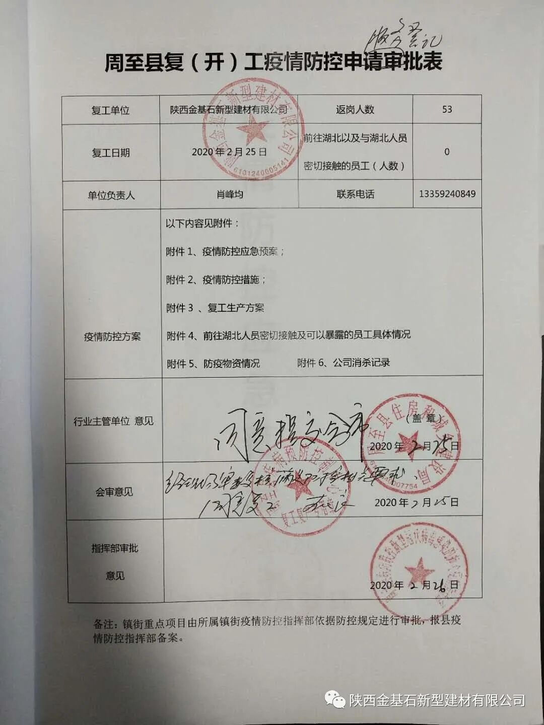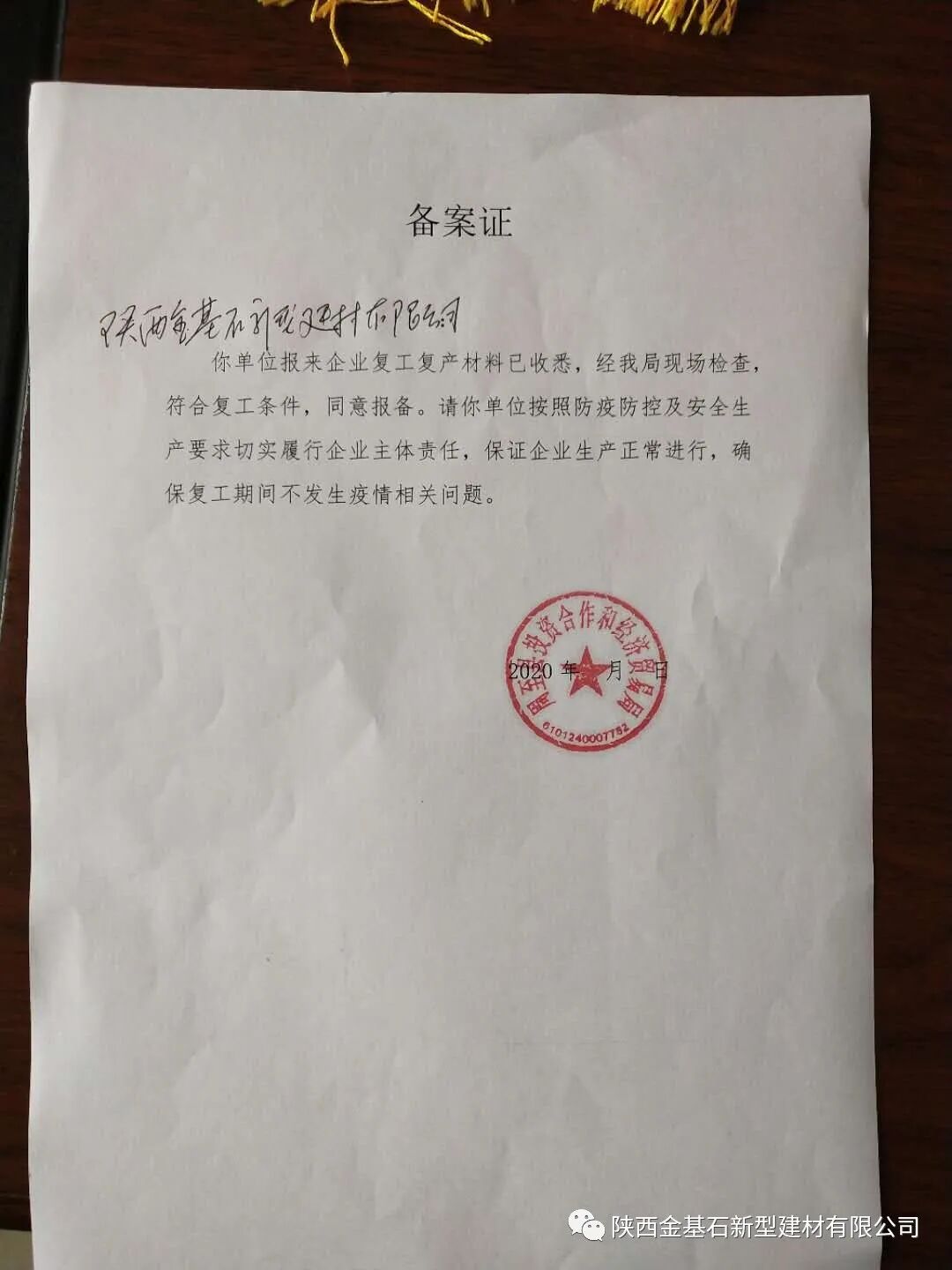 七、截止于2020年2月26日,我公司通过了---周至县联防联控指挥部,周至县建筑管理处和周至县经贸局3家上级单位的现场检查和复产材料审核,并收到同意我公司复工的批复,现已完全符合复工条件!
