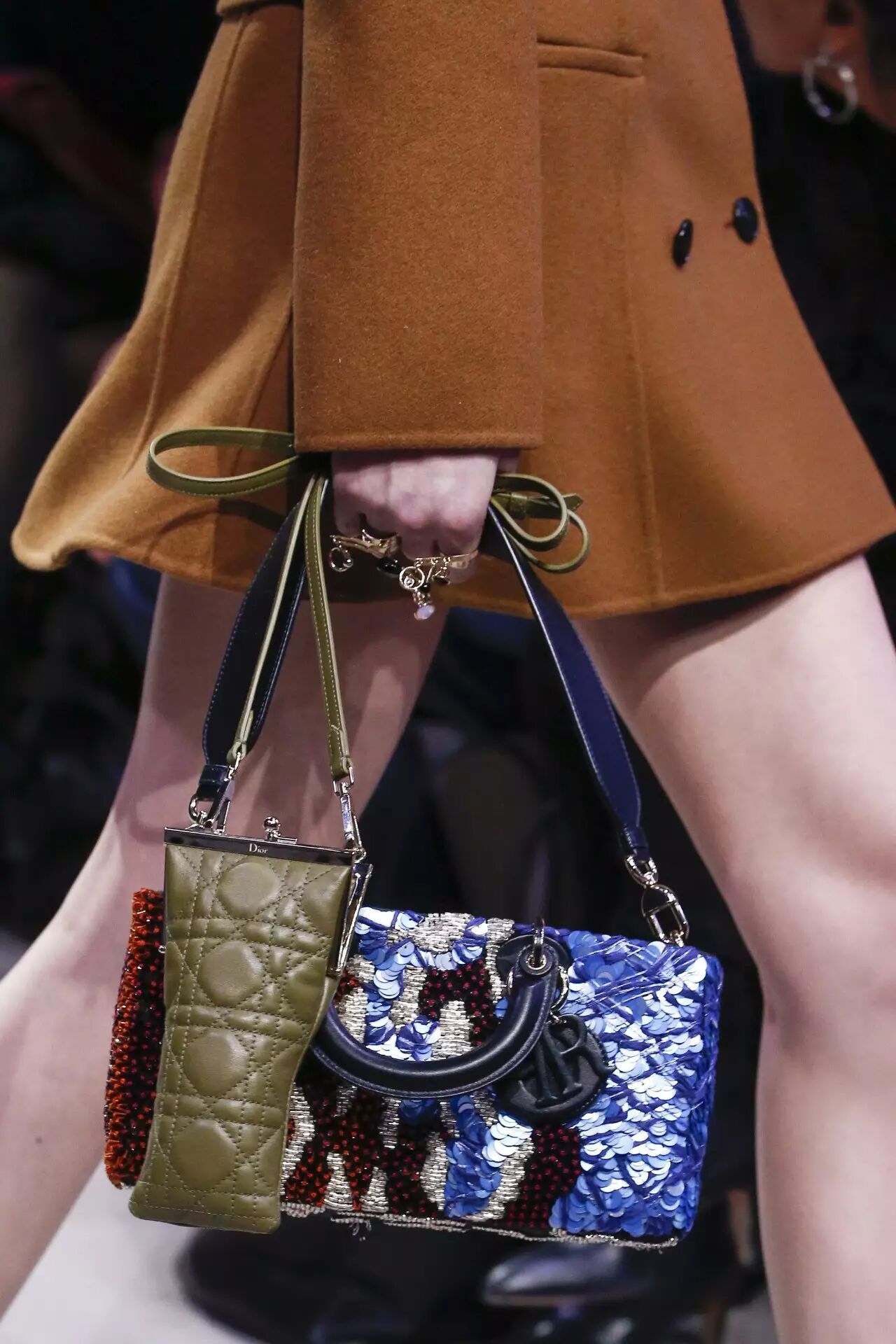 配饰方面则更加精彩。不仅有镜面带有图案的眼睛,还有更多分区的手包搭配上各式大小不一的墨镜袋,更加有趣。新的 Dior 也带来了全新的符号“全刺绣拼接皮包”,鸵鸟皮、鳄鱼皮与蜥蜴皮结合成为一套新的美学幻想。