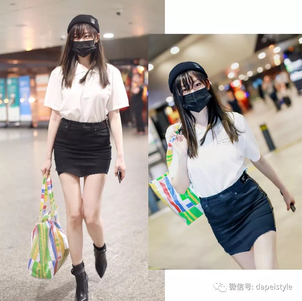 白衬衫+黑色小短裙,黑白撞色简约明了,融入了彩虹颜色的手袋毫无疑问锦上添花,踩上小短靴,要搁以前的张天爱身上不知道又得迷倒多少粉丝,不过放到现在有了齐刘海的她这儿,莫名的乖巧可爱起来~