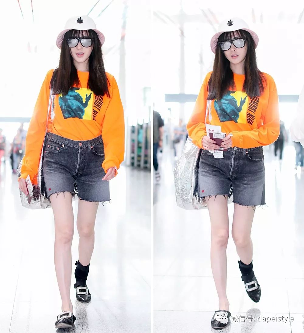 橘黄色卫衣超级扎眼,下搭低调的深灰色短裤静静做衬托,配上减龄齐刘海更是挡不住的冒出活力。话说这身行头亮点还真是有点多啊,就连脚下的袜子都只穿了一只,叛逆个性的潮酷girl形象呼之欲出~