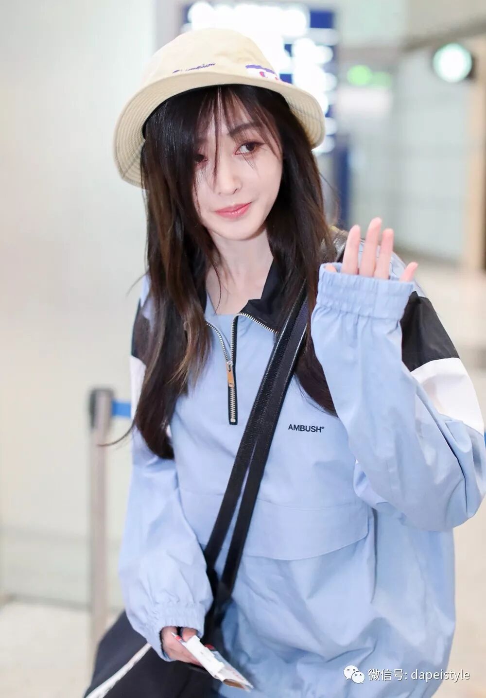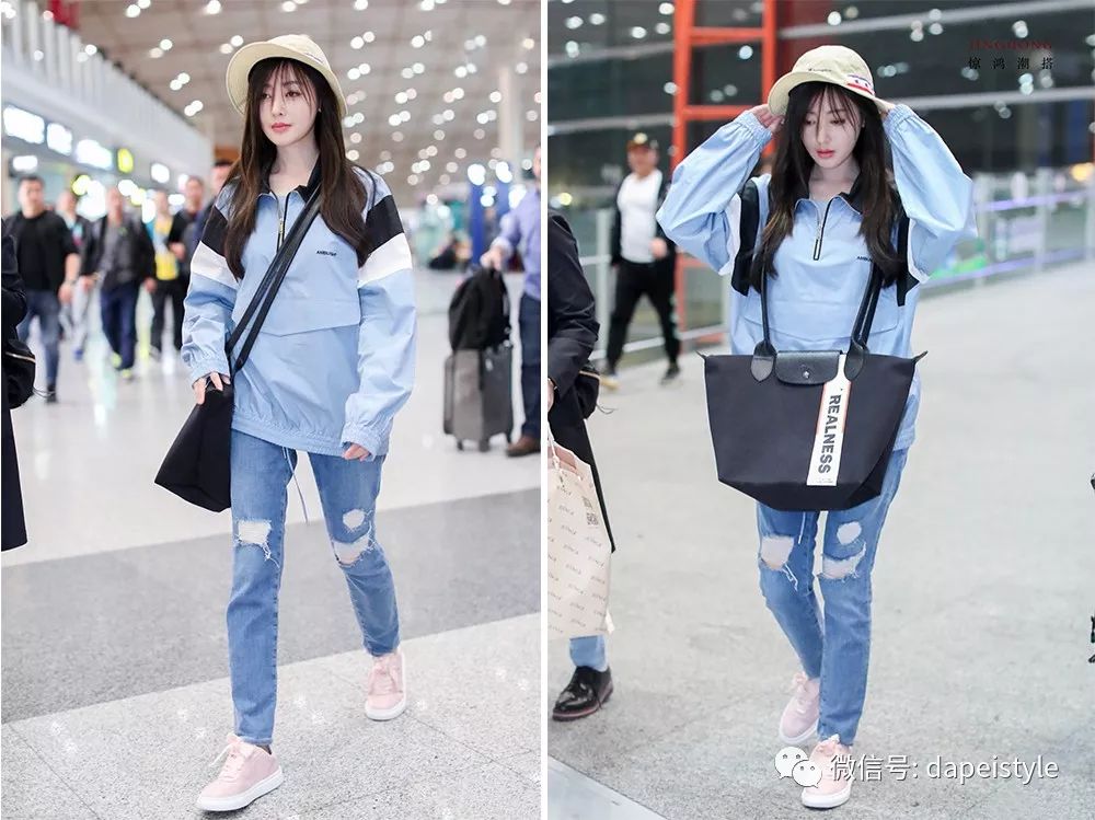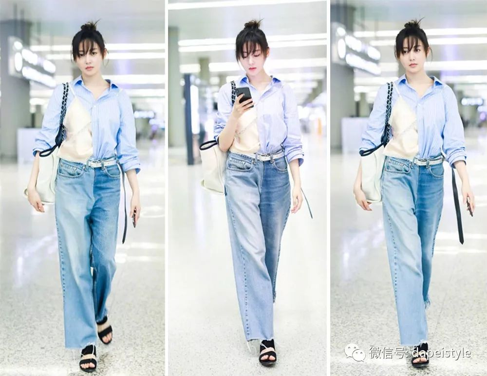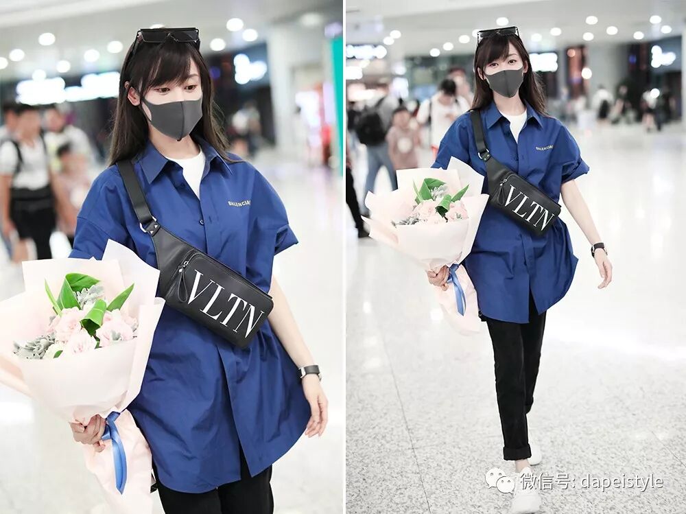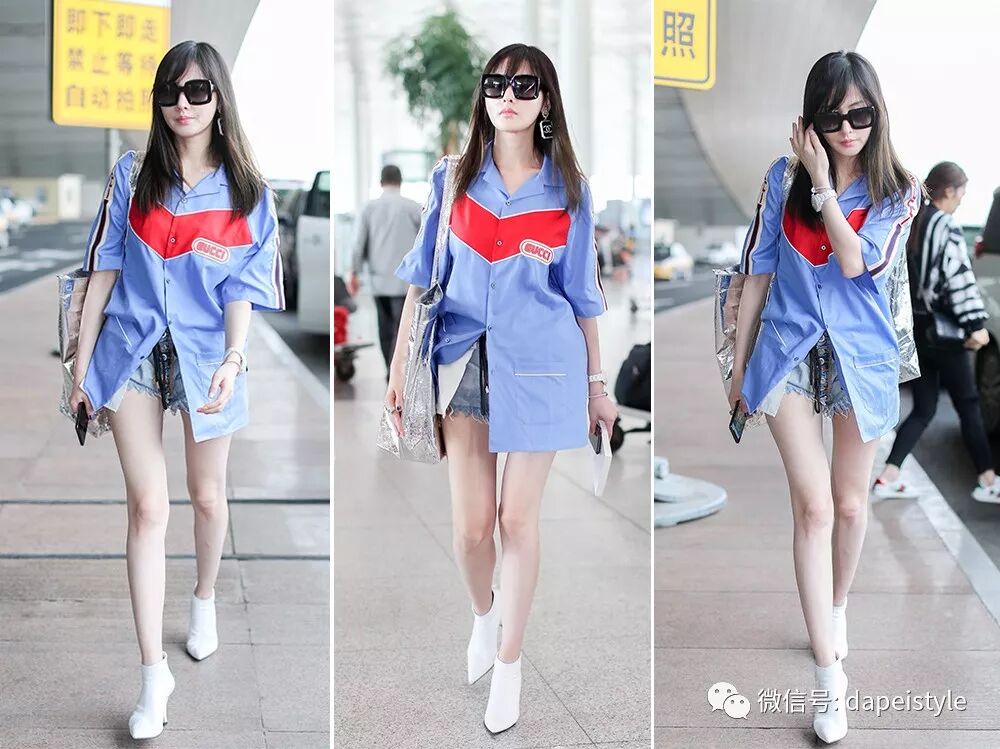 据说刘海和丸子头才是绝配,于是张天爱扎起头发,穿上清爽的蓝色系单品,同色搭配别提多亮眼了。解构式衬衫有了腰带和挎包的呼应也不再孤单,顺带还和黑色凉鞋形成对比,走在机场全是轻松休闲的意思啊,只不过我感觉这刘海有点挡眼......