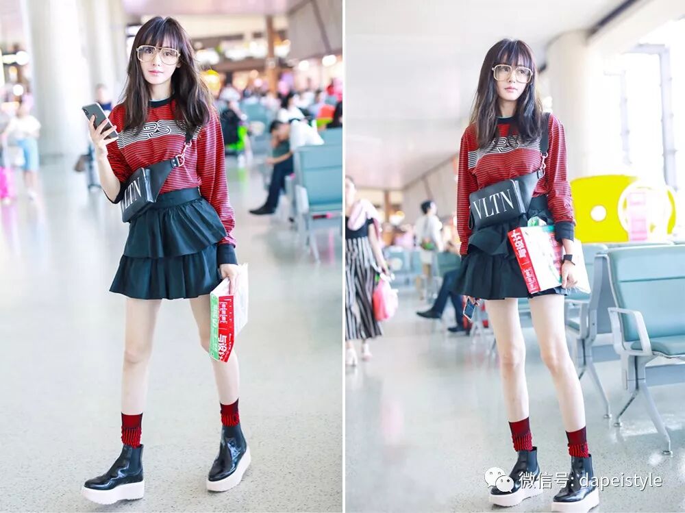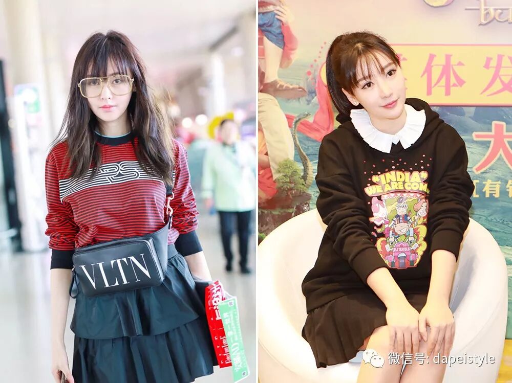微卷的长发配上自然的刘海,单看发型就知道减龄的功效还是蛮厉害的,不仅瞬间嫩回18岁,连小呆萌的感觉都像换了个人。红色条纹卫衣搭配黑色小短裙的造型也完美呼应了新发型,连长袜细节都透露着满满的活泼俏皮~