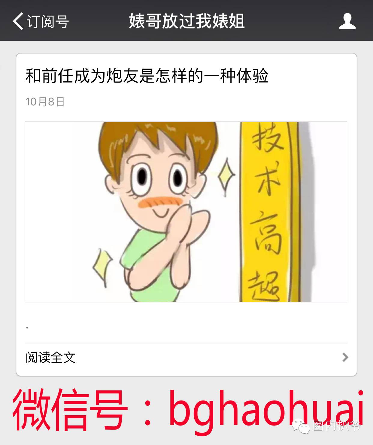 微信最浪段子手”婊哥放过我婊姐“---不求同年同日生,但求同房同床同套套,看婊哥漫画,纵享湿滑体验。人不能为了脸,连啪啪啪都不分享了。今天的更新是男和前任成为炮友是怎样的一种体验,你们可以扫了看!