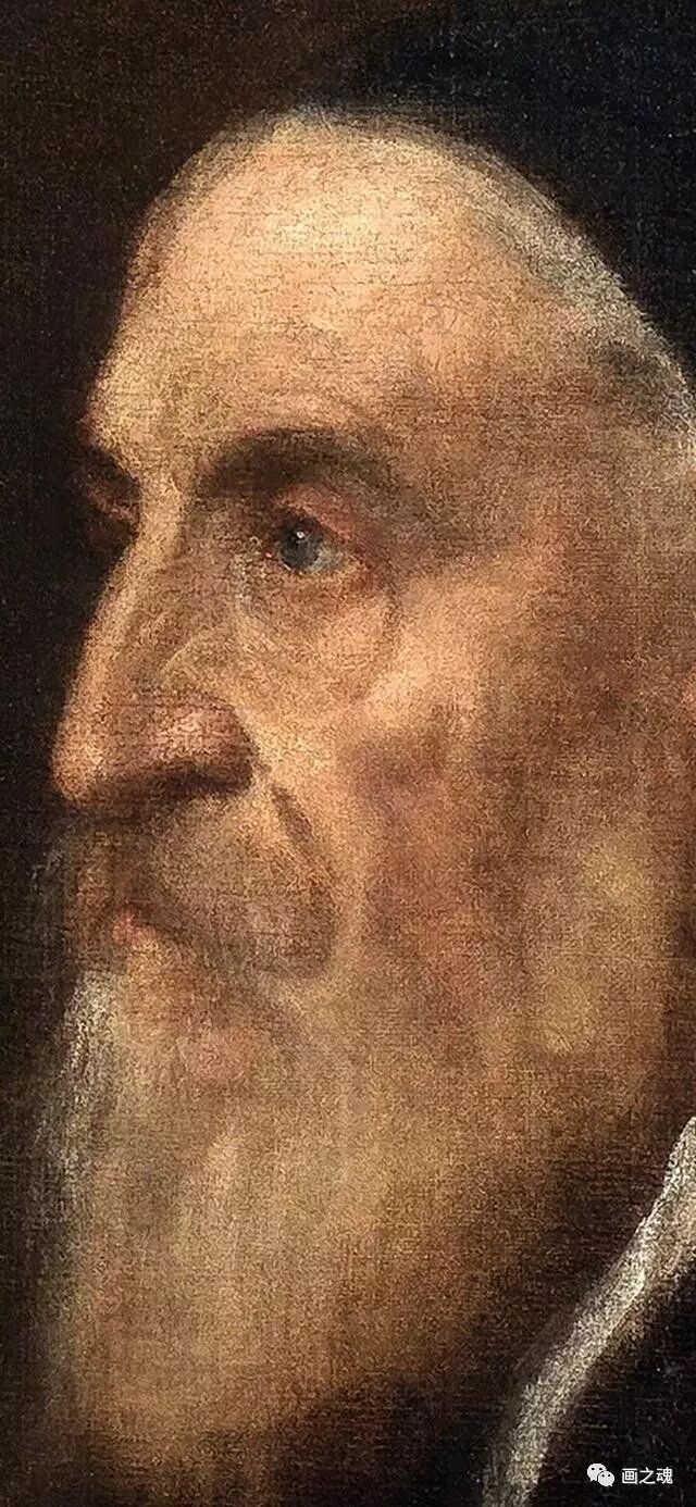 同时用船上的亚麻帆布替代了木板作画,很多大的油画不易用沉重的木板,中粗麻布上作画经济而且便于拆卸携带,提香·韦切利奥的油画多是在画布上画的。如右图,麻布的纹理清晰可见。