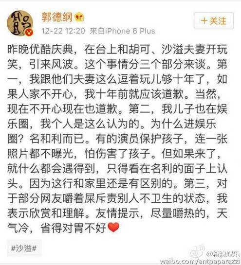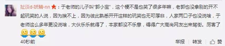 沙溢胡可夫妇前两天公开回应了郭德纲在某颁奖典礼上关于“安吉是我儿子”的过分言论,称“开玩笑还得把握尺度”,直接打脸郭德纲的所谓“一直跟他们是这么开玩笑的”。