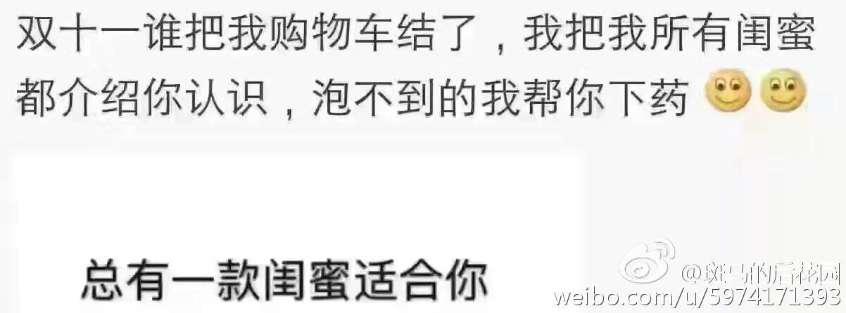 这让我想起今年双十一之前,不知道是谁编了一条恶俗无比的玩笑:双十一谁把我购物车结了,我把所有闺蜜都介绍你认识,泡不到的我帮你下药,总有一款适合你。