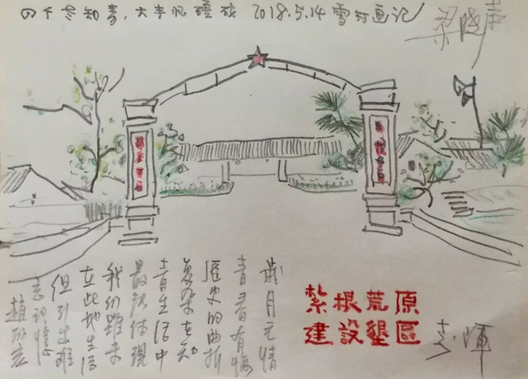 大丰知青纪念馆速写之一,三位曾经的知青梁晓声、李辉、赵丽宏在画上题词并签名,其中赵丽宏写道“岁月无情,青春有悔……”