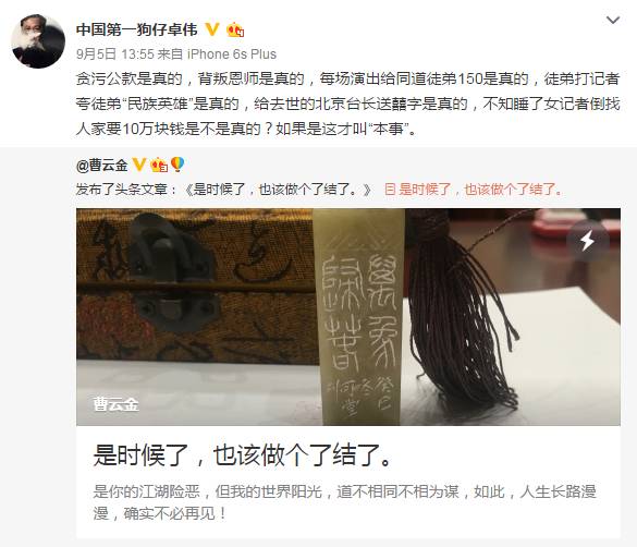 而在此次事件中,“中国第一狗仔卓伟”在曹云金发文之后,他转发文章并称:“贪污公款是真的,背叛恩师是真的,每场演出给同道徒弟150是真的,徒弟打记者夸徒弟‘民族英雄’是真的,给去世的北京台长送囍字是真的,不知睡了女记者倒找人家要10万块钱是不是真的?如果是这才叫‘本事’。”