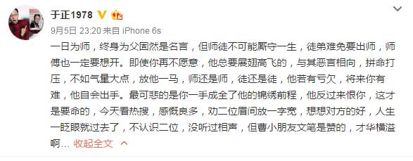 编剧于正也在微博中参与了此事的讨论,劝当事双方都要放宽心,各退一步。“一日为师,终身为父固然是名言,但师徒不可能厮守一生,徒弟难免要出师,师傅也一定要想开。即使你再不愿意,他总要展翅高飞的,与其恶言相向,拼命打压,不如气量大点,放他一马,师还是师,徒还是徒,他若有亏欠,将来你有难,他自会出手。最可悲的是你一手成全了他的锦绣前程,他反过来恨你,这才是要命的,今天看热搜,感慨良多,劝二位眉间放一字宽,想想对方的好,人生一眨眼就过去了,不认识二位,没听过相声,但曹小朋友文笔是赞的,才华横溢啊……”