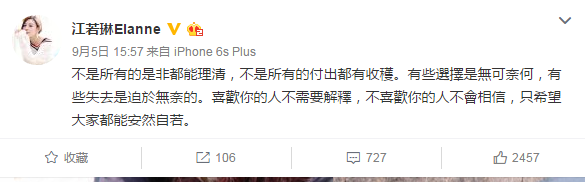 作为曹云金女友,原本与曲艺界距离甚远的江若琳通过微博力挺男友称:“不是所有的是非都能理清,不是所有的付出都有收获。有些选择是无可奈何,有些失去是迫于无奈的。喜欢你的人不需要解释,不喜欢你的人不会相信,只希望大家都能安然自若。”