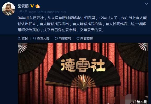 作为目前德云社除郭德纲最红的台柱子,岳云鹏的态度很受外界关注,而岳云鹏则是在曹云金发出长文之前就已经在微博中表达力挺师父:“2004年进入德云社,从来没有想过能够走进相声界,12年过去了,走在街上有人能够认出我来,有人能够找我演出,有人能够找我拍戏,有人找我代言,这一切都是师父给我的,庆幸自己身在云字科,义薄云天的云。”