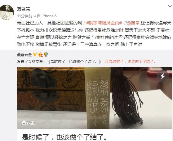 作为民间相声团体成员,“相声第二班”的王自健,“陕西青年曲艺社”的班主苗阜也都通过微博进行了发声。