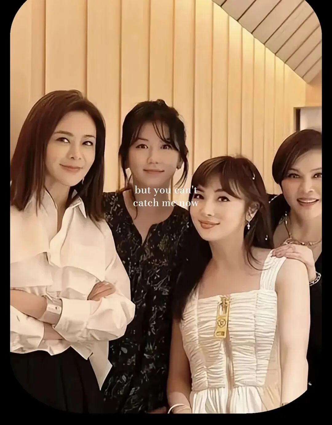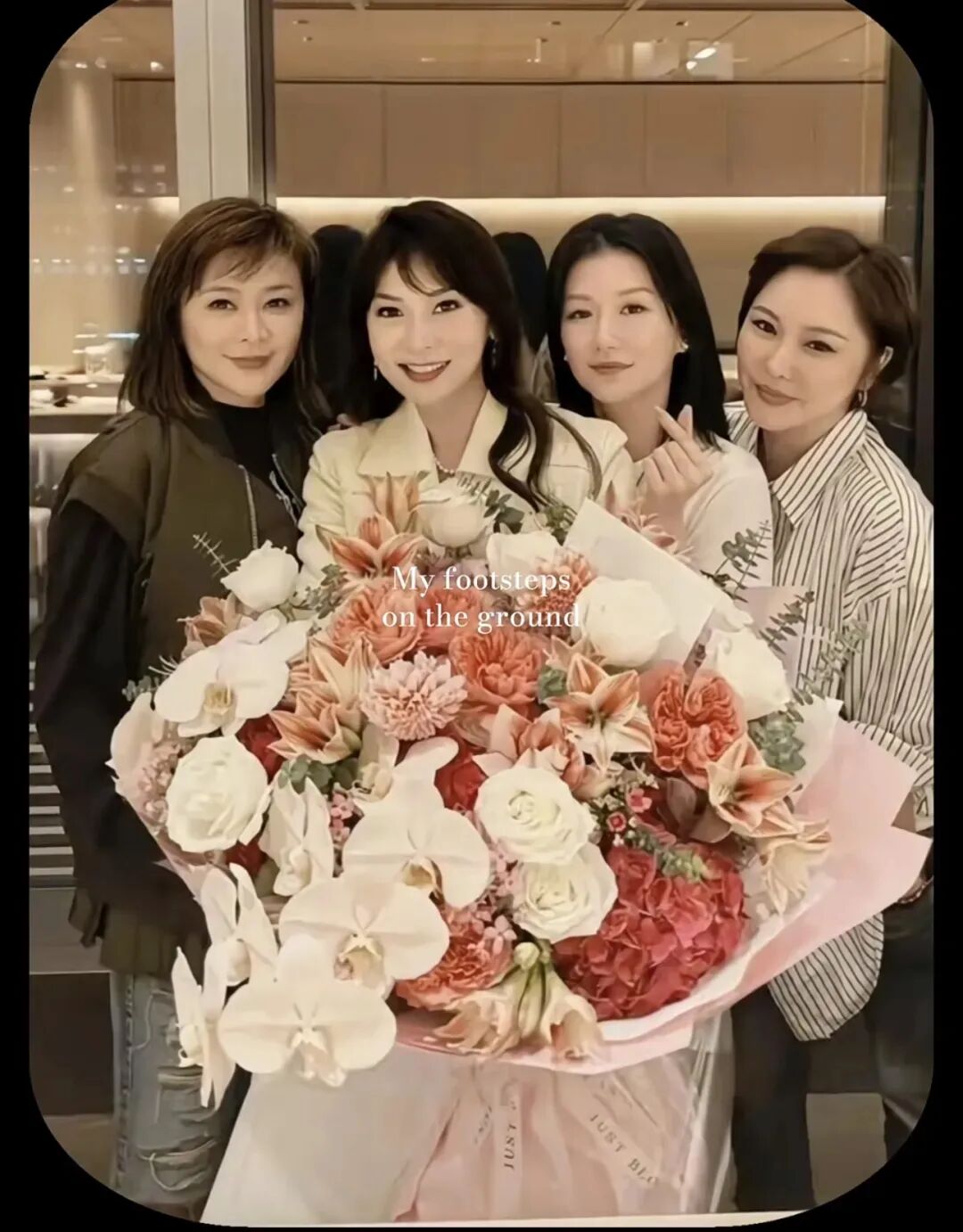 在照片中,位于最左侧的关之琳身着一件简约而不失庄重的黑色上衣,显得沉稳大方。上衣的剪裁得体,勾勒出她曼妙的身姿。她的笑容温婉,与身旁的好友紧紧相拥,共同举着一束绚烂的花束。黑色上衣的映衬下,她的肌肤更显白皙细腻,仿佛岁月未曾留下任何痕迹。整体穿搭简约而不简单,完美展现了关之琳优雅的气质与独特的韵味。