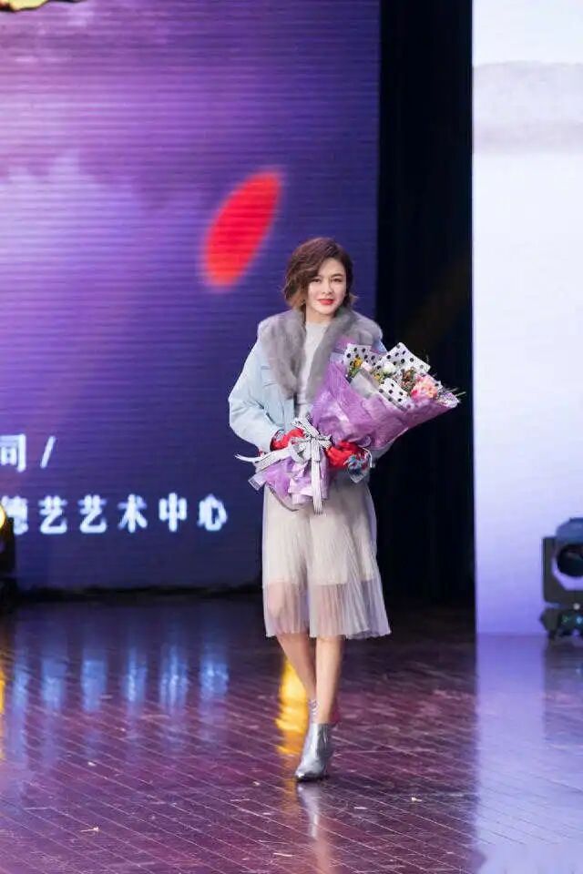 关之琳身着一袭灰色毛衣,搭配浅色裙装,尽显温婉气质。银色高跟鞋点亮整体造型,增添一抹亮丽。披肩秀发随风轻扬,脸上洋溢着迷人微笑。手中花束更添庆典氛围,紫色幕布前,她宛如艺术中心里最耀眼的明星。