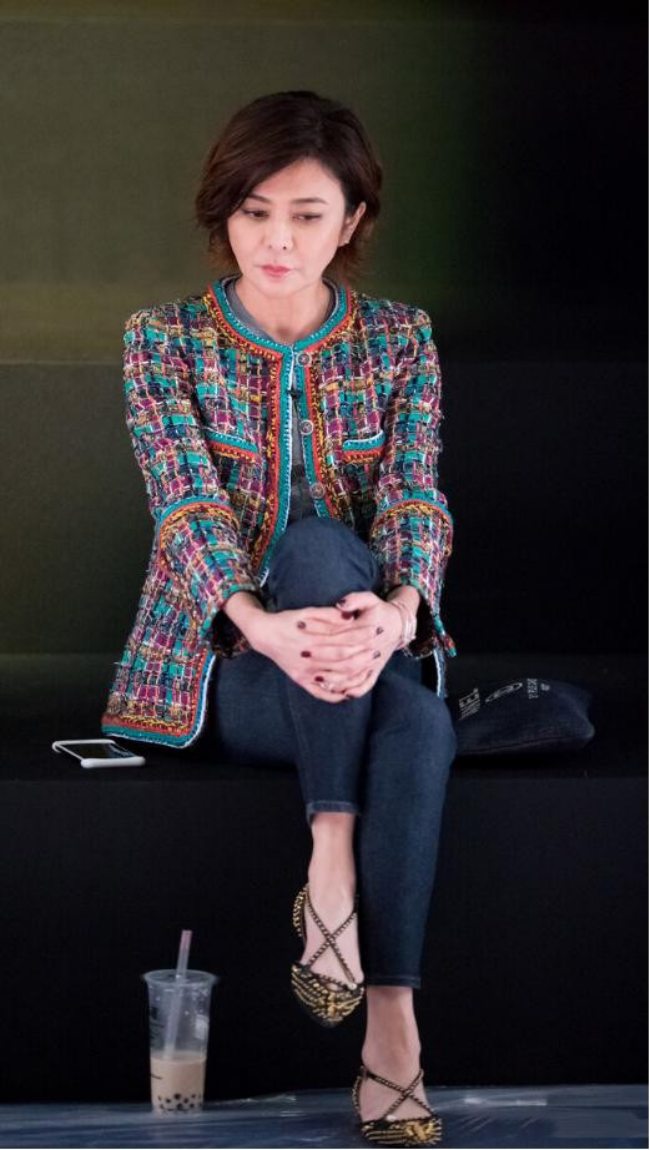 关之琳身着多彩外套,红蓝绿等鲜艳颜色交织,亮片与珠子点缀其间,彰显独特魅力。下搭深色紧身裤,脚蹬金色棕色图案高跟鞋,尽显优雅身姿。双手交叠于膝,静待沉思。身旁奶茶与黑包相伴,模糊背景难掩其风采。
