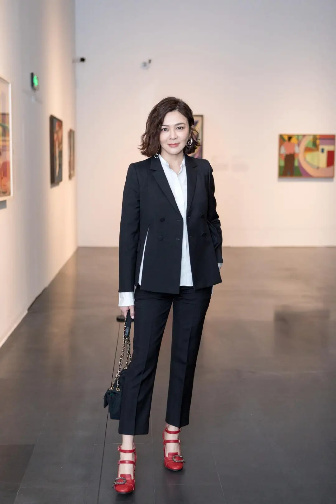 关之琳身着黑色西装外套,内搭简约白色衬衫,下穿黑色修身长裤,脚蹬一双耀眼的红色高跟鞋,手提经典黑色皮包,尽显干练与优雅。她棕色的及肩秀发自然垂落,笑容灿烂地看向镜头,仿佛每一帧都定格为艺术品,散发出迷人的艺术气息。