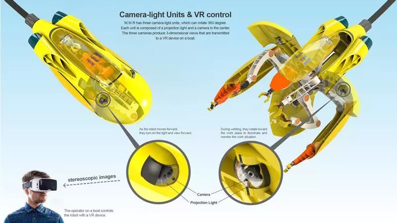 Today, various ocean constructions such as marine cities, bridges, sea cable structures, and oil drilling facilities are being built every day. To construct these structures, divers must enter the deep sea and weld steel frames. The working condition under the sea is fatally dangerous. Due to unexpected tide, high pressure, electric shock and explosion, it is reported that 30 accidents occur per 200 sea water welding cases. Regardless of all efforts, it is almost impossible to achieve zero fatalities unless the human divers are substituted by robots. We designed MWR, which is a transformable robot, to save underwater welding workers. This robot has three camera-light units, three legs, and one welding and two auxiliary arms. The three propellers enable the robot to move to any direction easily. The power is supplied through the cable connected the tail of the robot. The operator above the sea can easily control the robot and monitor the working status through VR glasses connected to the three cameras. MWR will not only save welding divers but also make much progress in the area of ocean construction.