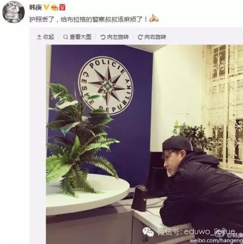 昨晚,韩庚哥哥发了条微博,如上图:“护照丢了,给布拉格的警察叔叔添麻烦了。”