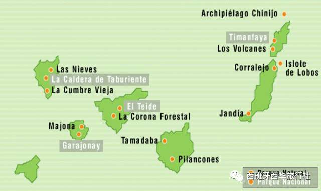 加那利群岛由七座主要岛屿构成,由西向东分别是耶罗岛(El Hierro)、拉帕尔马岛(La Palma)、戈梅拉岛(La Gomera)、特内里费岛(Tenerife)、大加那利岛(Gran Canaria)、富埃特文图拉岛(Fuerteventura)和兰萨罗特岛(Lanzarote),每座岛屿都各有千秋,风格截然不同,囊括了各种地貌和千奇百怪的风景。而群岛上的四座火山地貌的国家公园分别是位于拉帕尔马岛的塔武连特山(la Caldera de Taburiente)国家公园、戈梅拉岛的加拉霍奈(Garajonay)国家公园、特内里费岛的泰德峰(el Teide)国家公园和兰萨罗特岛的蒂曼法亚火山(Timanfaya)国家公园。